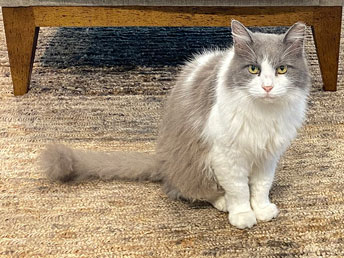 The handsome Fluffy is open to head scratches to those who are patient enough to earn his trust. Fluffy shares dual residence at the store and lounging deck and poolside at a nearby home.