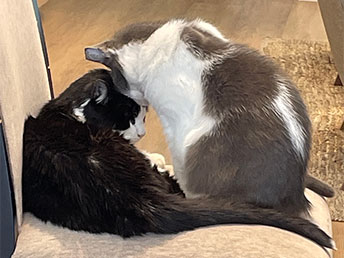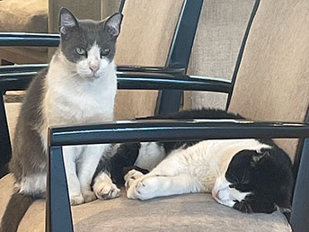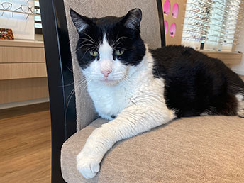 Mittens, the elder statesman, has appointed himself an Official Greeter. His handsome tuxedo appearance and unflappable calm make Mittens the 007 of the feline world. He loves people and, when not asleep in a chair, meanders about with an eye out for a vacant seat or inviting lap to snuggle into. So, take a seat at your own risk.